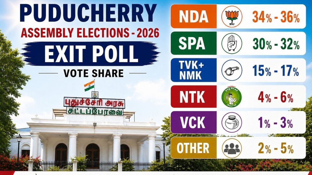 కేంద్ర పాలిత ప్రాంతమైన పుదుచ్చేరిలో ఎన్డీయే కూటమి మరోసారి విజయపతాకం ఎగురవేయనుంది. పీపుల్స్ పల్స్ ఎగ్జిట్ పోల్ సర్వే వెల్లడించిన వివరాల ప్రకారం.. ముఖ్యమంత్రి ఎన్. రంగస్వామి నేతృత్వంలోని ఎన్డీయే కూటమి అధికార పీఠాన్ని నిలబెట్టుకోవడం ఖాయంగా కనిపిస్తోంది. మొత్తం 30 అసెంబ్లీ స్థానాలున్న పుదుచ్చేరిలో అధికారానికి కావాల్సిన మ్యాజిక్ ఫిగర్ 16-17. ప్రత్యర్థి సెక్యులర్ ప్రోగ్రెసివ్ అలయన్స్ (SPA) కూటమి 10-12 సీట్లు గెలుచుకునే అవకాశం ఉంది, ఇతరులు 1-2 సీట్లు గెలుచుకునే అవకాశం ఉంది.